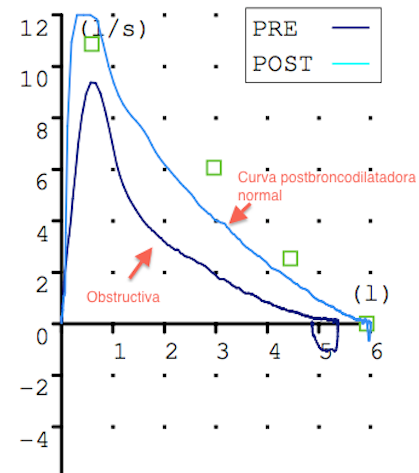 En un patrón obstructivo el descenso de la curva desde el flujo pico es claramente cóncavo.