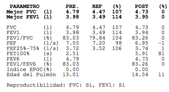 Pueden verse en la imagen varias columnas. La encabezada con PRE. son los datos del paciente, lo que ha soplado. La encabezada con REF. muestra los datos de las tablas de referencia poblacional con los que comparamos a nuestro paciente (Son los datos que obtendría una persona sin patología con la misma tipología del nuestro paciente, edad-sexo-talla). En (%) se calcula automáticamente el porcentaje obtenido por nuestro paciente respecto a la referencia poblacional. POST encabeza los datos de la prueba broncodilatadora de la que hablaremos en otra entrada.