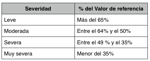 Otra aún más sencilla solo estable tres grados. Leve (60 a 80%), moderada (40 a 60%) y severa (menor del 40%)