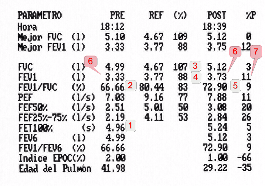 Índice FEV1/FVC. Nos muestra un dato inferior al 70%. (2) Esto nos permite afirmar que se trata de un patrón obstructivo.