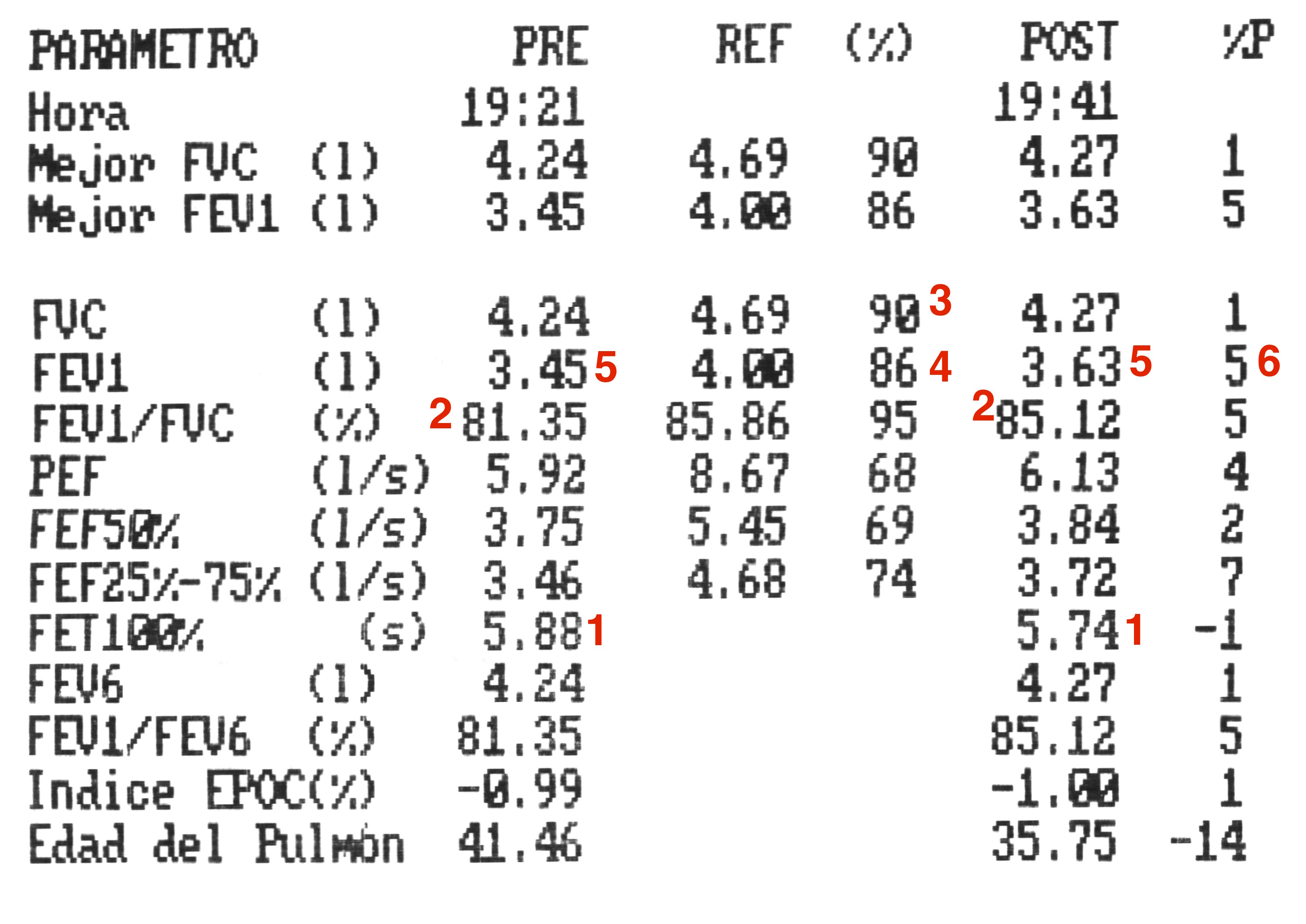 Prueba broncodilatadora. Hay casi 200 mL entre ambas. La POST son 3.63 y la PRE 3.45. (5) Son 180 mL. No cumple el criterio de ser mayor de 200 mL pero se acerca. Esto nos puede poner en alerta pero la diferencia no es más que un 5%. (6) Prueba broncodilatadora negativa.