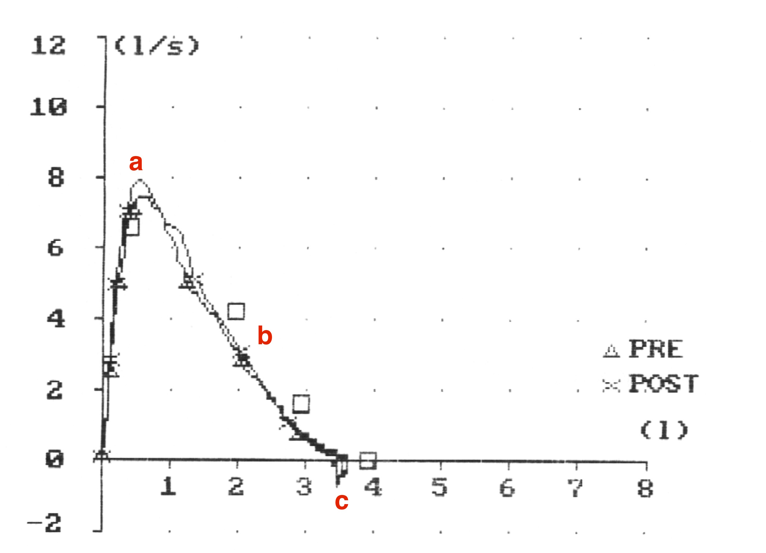 La curva tiene una morfología normal. Ascenso rápido con pico claro (a), descenso sin artefactos (b) y final suave. La llamada c muestra un trazado bajo el eje de abscisas. Esto corresponde a una inspiración del paciente durante la maniobra. Al ocurrir al final de la maniobra no interfiere en la interpretación.