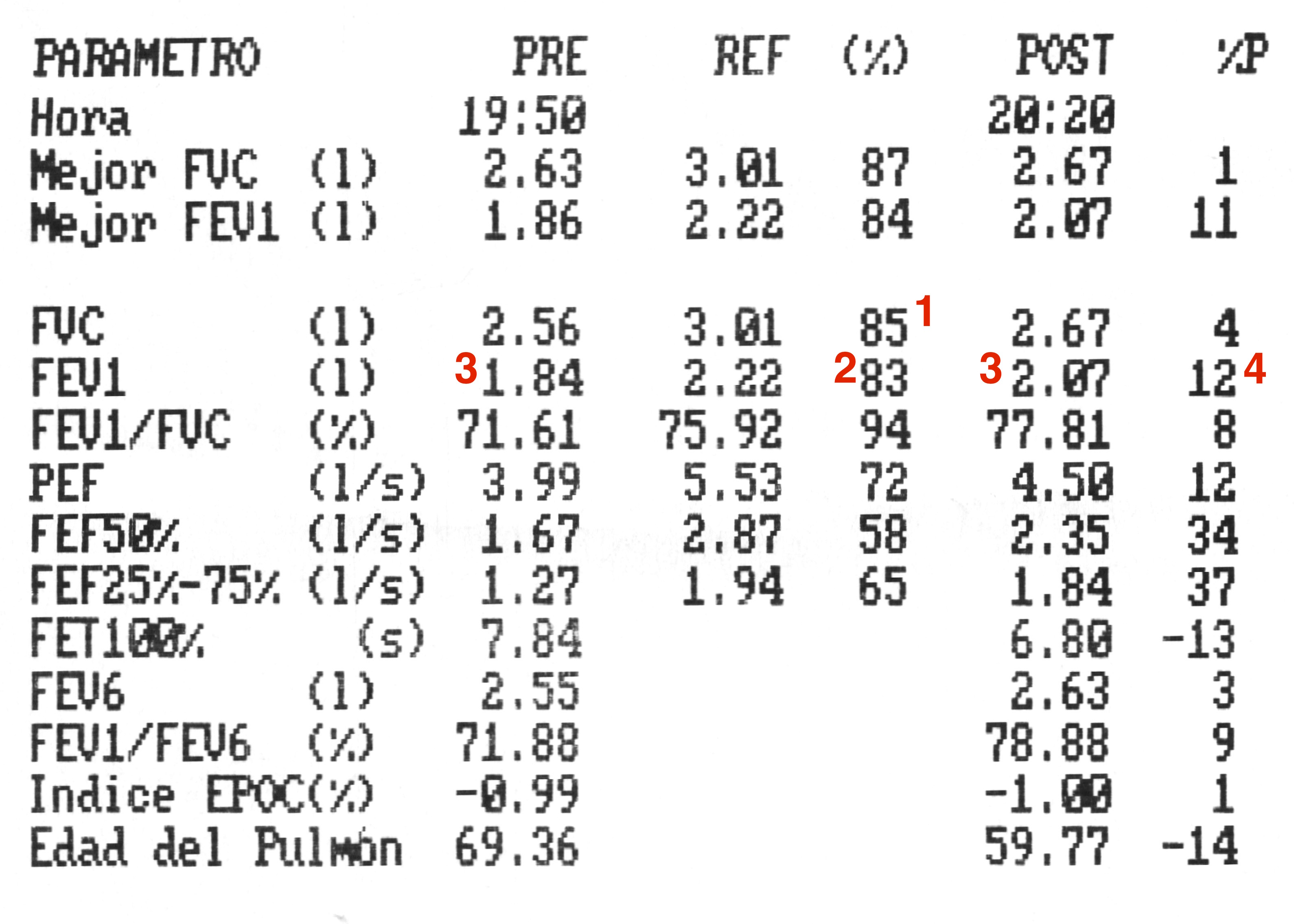 Prueba broncodilatadora. Aquí viene la sorpresa. El FEV1 mejora 203 mL (2.07-1.84) (3) y un 12%. (4) Cumple los dos criterios para considerar la prueba broncodilatadora positiva.