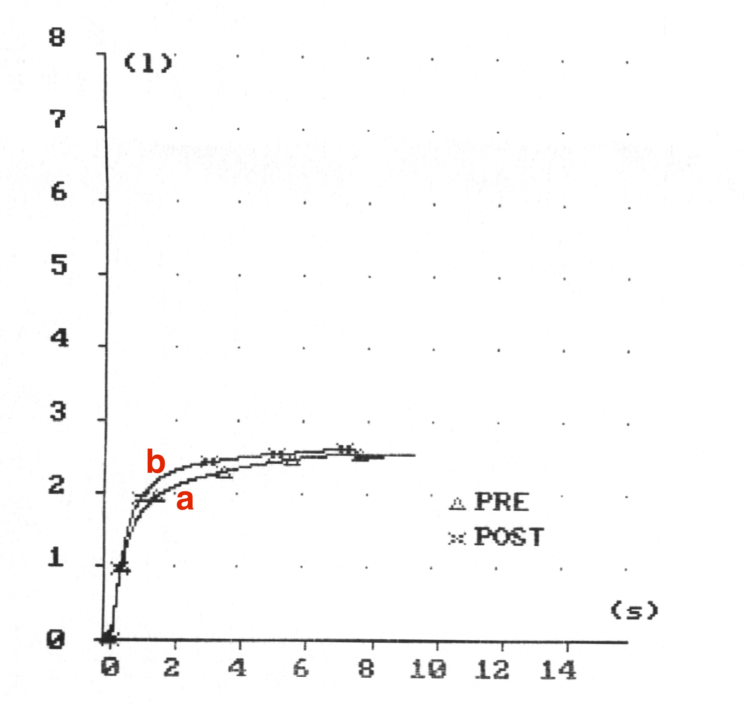 La curva tiene aspecto normal. Tiene ascenso rápido, pico claro y descenso sin incidencias ni concavidad. Lo más llamativo es la diferencia que apreciamos entre las dos curvas (a) siendo mayor la POST.