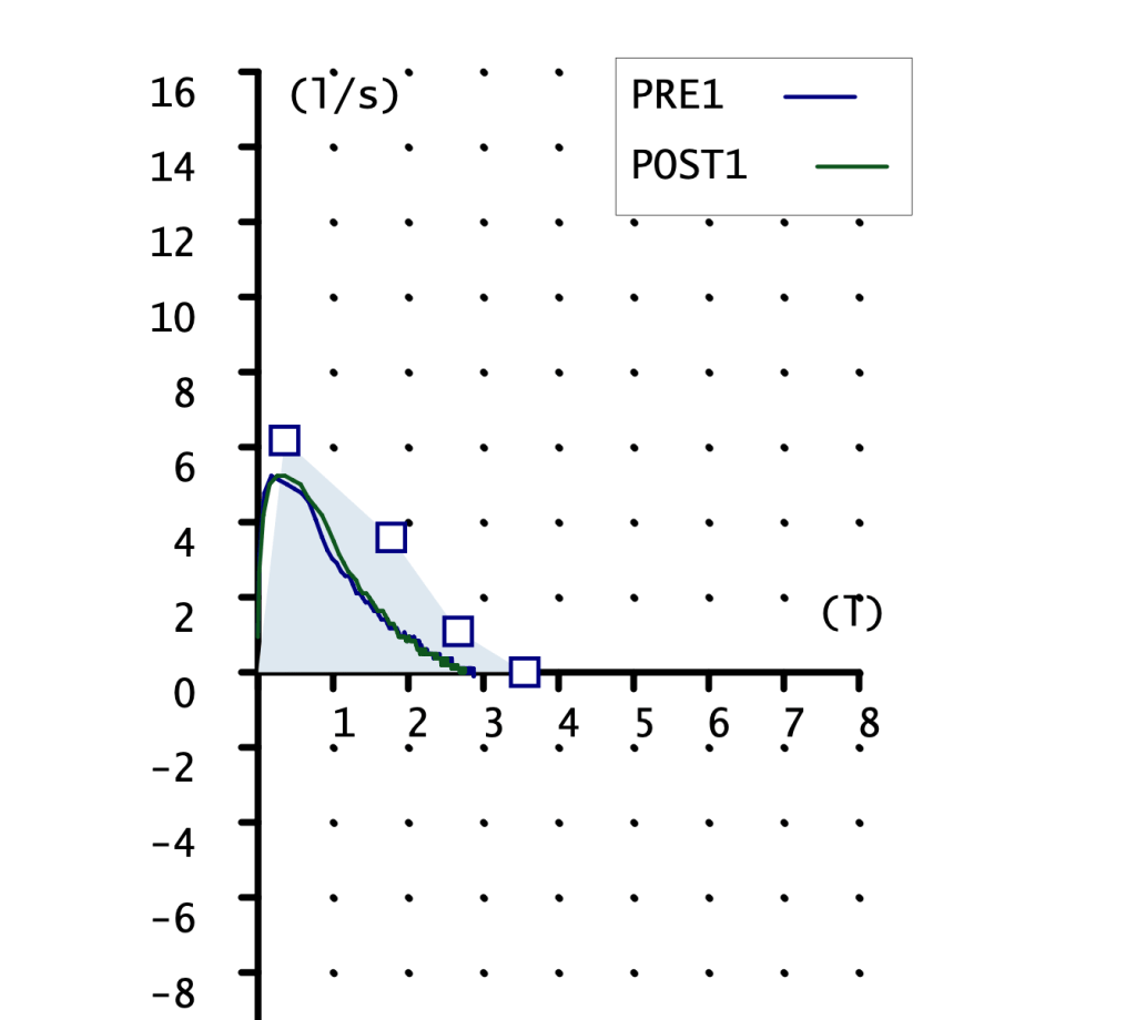 Son maniobras cortas como sugería la curva volumen-tiempo. 3,30 sg la maniobra basal y 2,92 sg la post. Esto hay que tenerlo en cuenta ya que los parámetros para los que el tiempo es importante pueden verse afectados.
