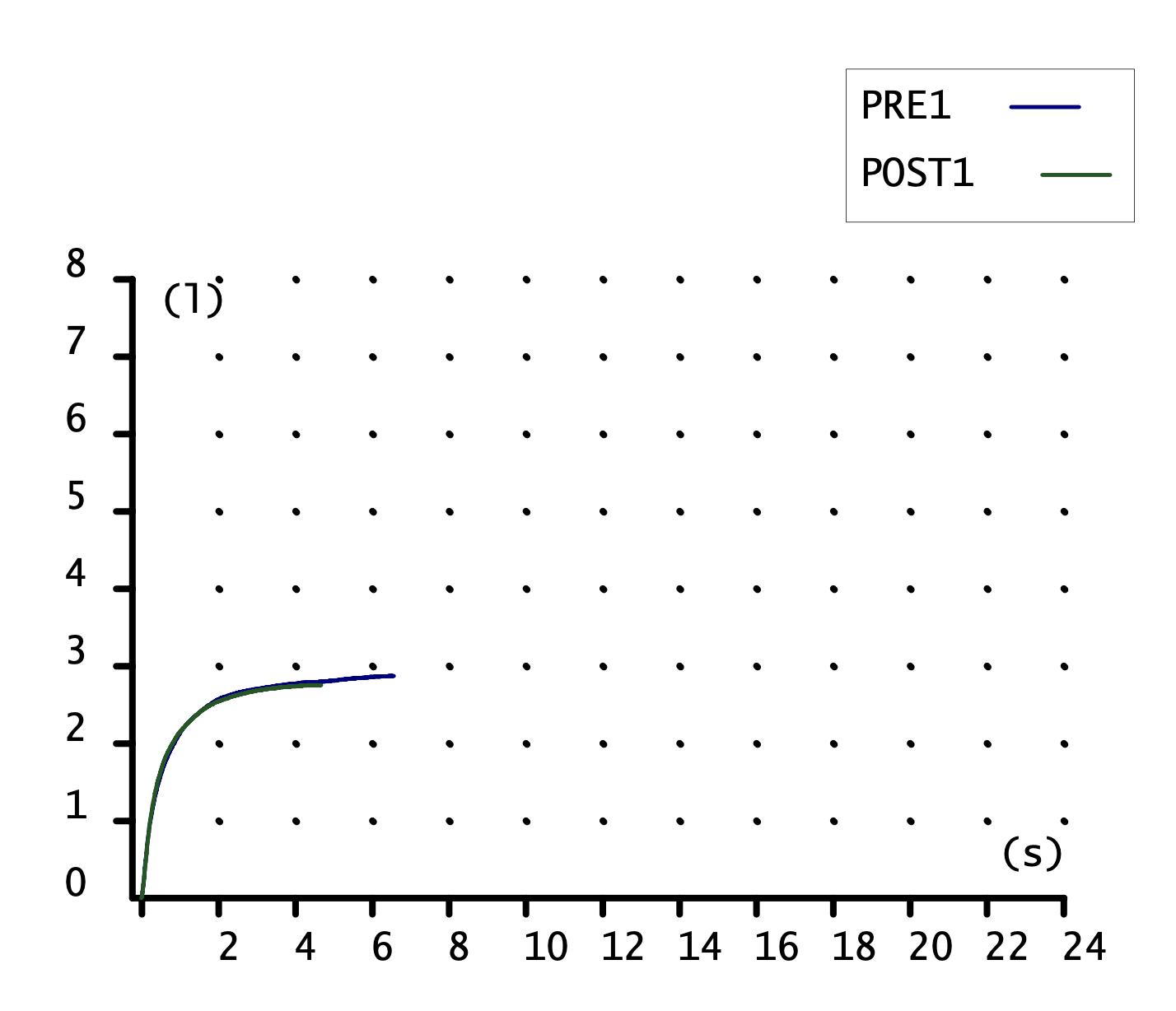 Gráficas de ascenso rápido y meseta. La pega es que parece corta de tiempo. Ninguna de las dos llega a dibujar hasta los 4 segundos. (Iínea de puntos). Más adelante vemos los datos.