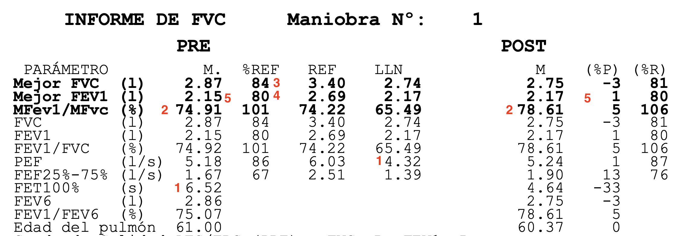 82% en la pre y 88% en la post. Si la maniobra es correcta y el principio de la espirometria esta bien soplada con la suficiente energía no hay problema porque la maniobra sea corta. De hecho es el parámetro más fiable en casos de maniobras cortas.